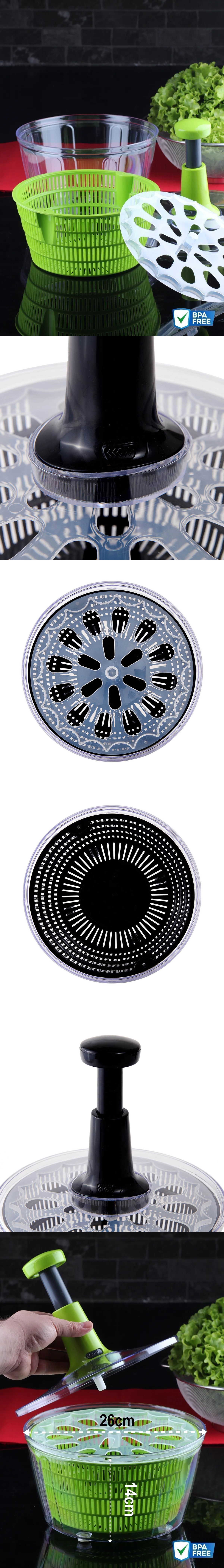 Bu pratik salata kurutucu, mutfakta zaman kazanmak isteyenler için ideal bir yardımcıdır. 26 cm çapındaki geniş haznesi sayesinde bol miktarda yeşilliği tek seferde kurutabilirsiniz.