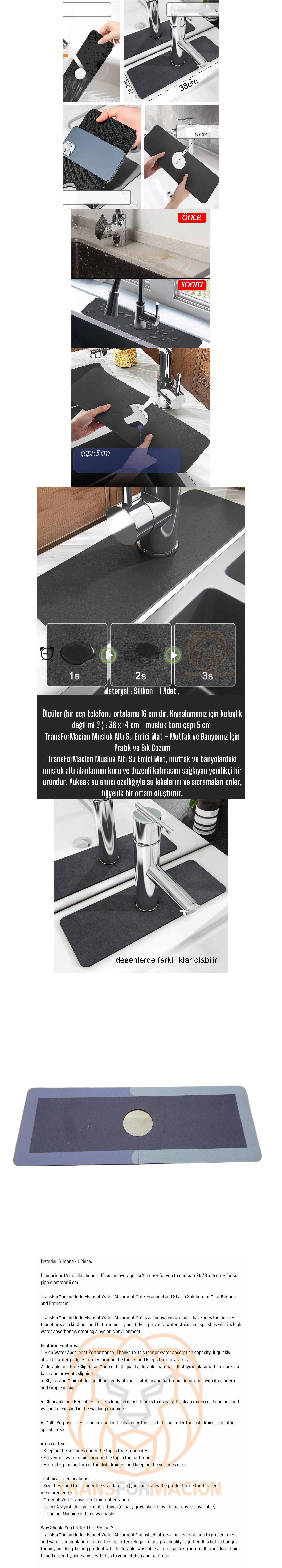 Musluk çevresindeki dağınıklığı ve su birikintilerini önlemek için mükemmel bir çözüm sunan Turk  Musluk Altı Su Emici Mat, şıklığı ve pratikliği bir arada sunar. Dayanıklı, yıkanabilir ve yeniden kullanılabilir yapısıyla hem bütçe dostu hem de uzun ömürlü bir üründür. Mutfak ve banyonuza düzen, hijyen ve estetik katmak için ideal bir seçimdir.