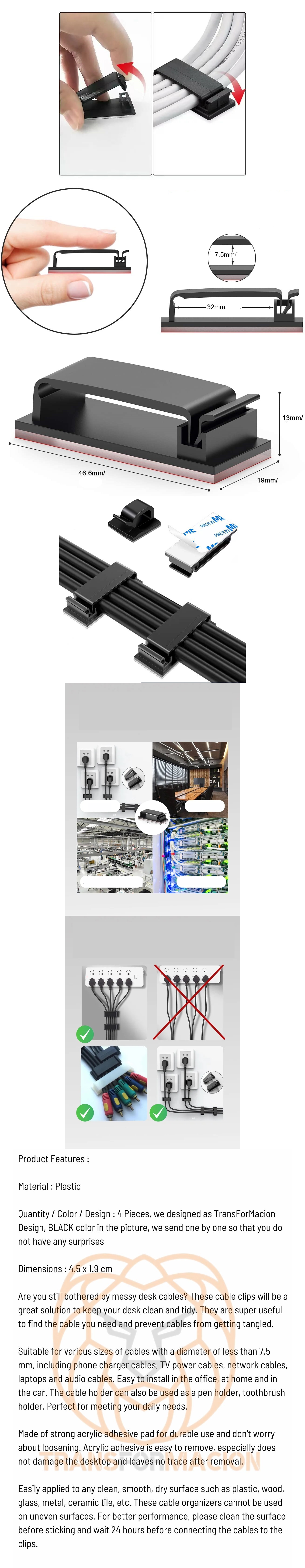 Telefon şarj kabloları, TV güç kabloları, ağ kabloları, dizüstü bilgisayarlar ve ses kabloları dahil olmak üzere çapı 7.5 mm'den küçük olan çeşitli boyutlardaki kablolar için uygundur. Ofiste, evde ve arabada kurulumu kolaydır. Kablo tutucu ayrıca kalemlik, diş fırçası tutucusu olarak da kullanılabilir. Günlük kullanım ihtiyaçlarınızı karşılamak için mükemmeldir.