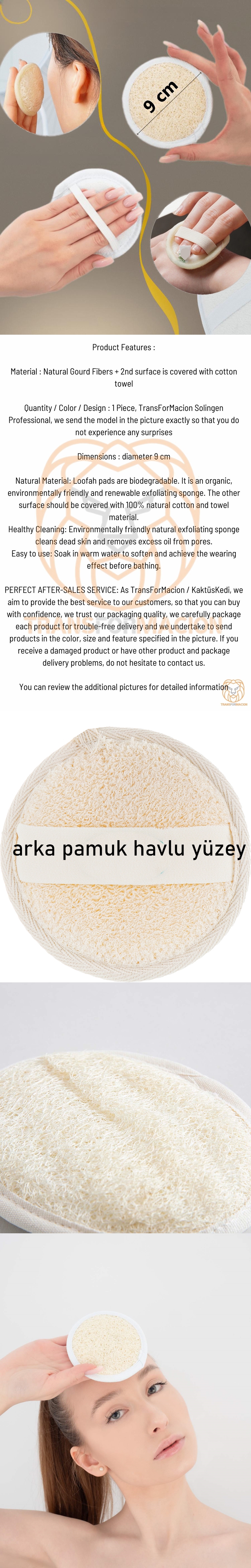 Doğal Malzeme: Lif kabağı pedler biyolojik olarak parçalanabilir. Organik, çevre dostu ve yenilenebilir bir peeling süngeridir. diğer yüzeyi %100 doğal pamuk ve havlu malzemesi kaplamalıdır.