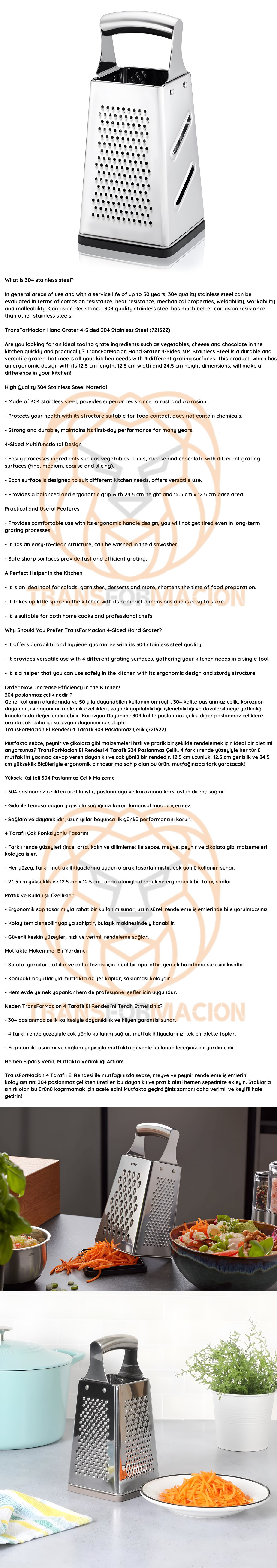 - 4 farklı rende yüzeyiyle çok yönlü kullanım sağlar, mutfak ihtiyaçlarınızı tek bir alette toplar.