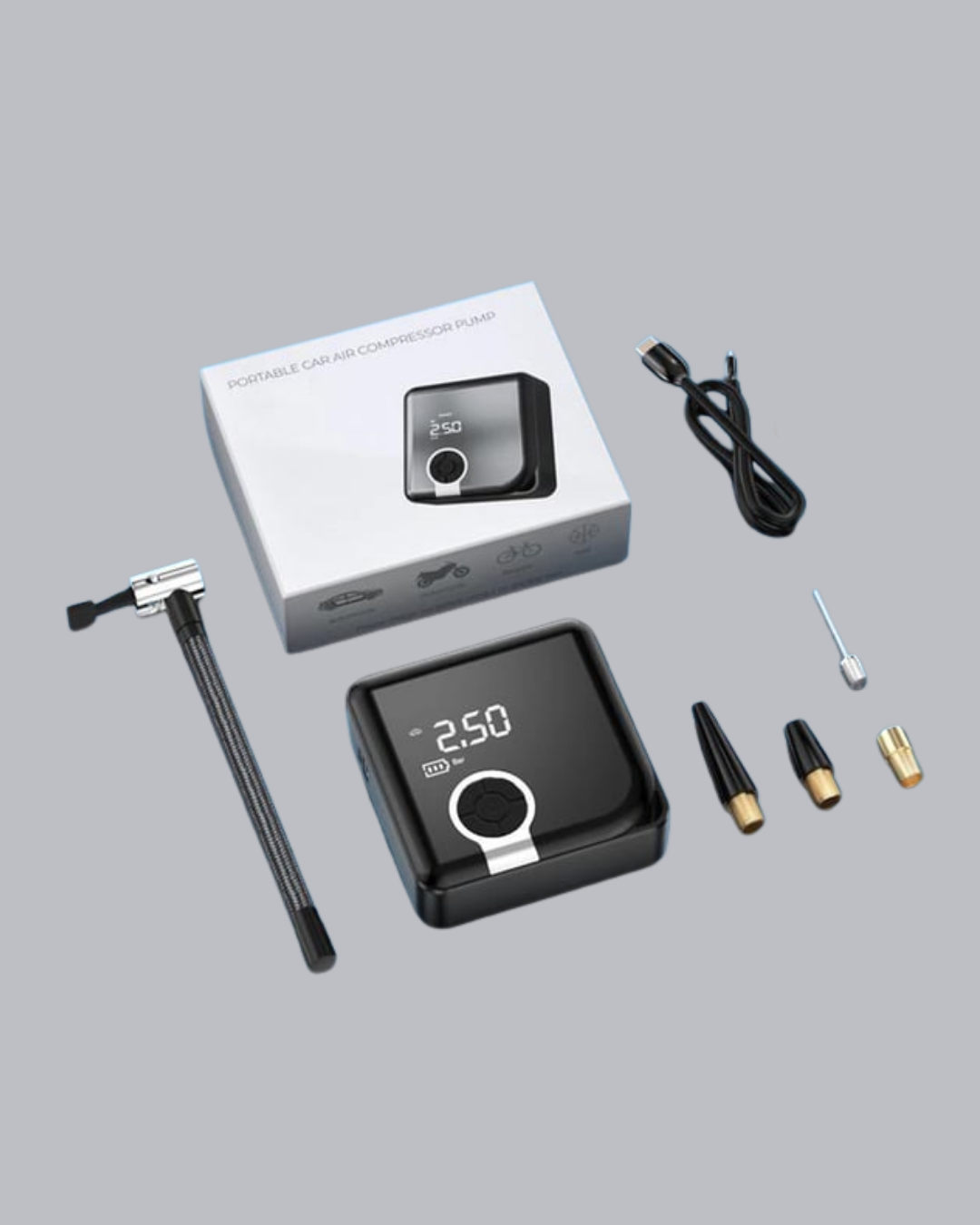 Yüksek performanslı taşınabilir dijital hava kompresörü, sürücüler için güvenlik ve konforu bir arada sunar. 150 PSI’a kadar basınç kapasitesi ile lastiklerinizi kısa sürede şişirebilir. Küçük boyutu ve hafifliği sayesinde aracınızda veya çantanızda kolayca taşınabilir.Dijital ekranı sayesinde basınç değerlerini anlık takip edebilir, farklı birimlerde ölçüm yapabilirsiniz. Önceden ayarladığınız basınca ulaşıldığında otomatik kapanma özelliği devreye girerek güvenliği sağlar.6000 mAh bataryası ile güçlü performans sunar. Tek şarjla dört lastiğe kadar şişirebilir. Type-C girişi ile cihazınızı hızlıca şarj edebilirsiniz. Ayrıca LED ışıklar sayesinde gece yolculuklarında veya acil durumlarda kolaylık sağlar.Bu cihaz, sadece araç lastikleri için değil, bisiklet, motosiklet, spor topları ve şişme ürünler için de uygundur. Kompakt boyutu, güçlü performansı ve dayanıklı yapısı ile günlük hayatta ve seyahatlerde yanınızdan ayırmak istemeyeceğiniz bir üründür.